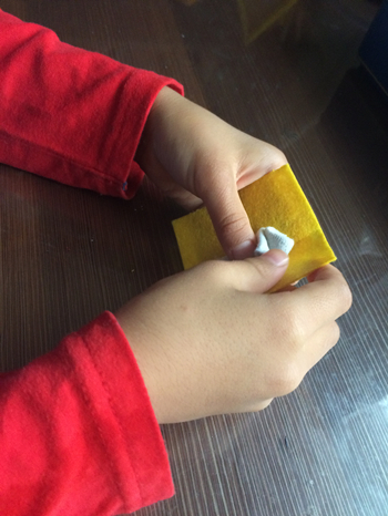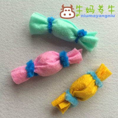 学龄前儿童玩不织布还不能缝,只能是粘、缠等,不织布糖果就是用毛根固定制作的。