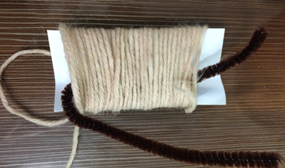 毛线缠绕纸板,毛根穿过,拧成一条。