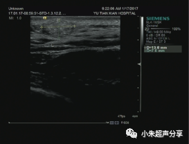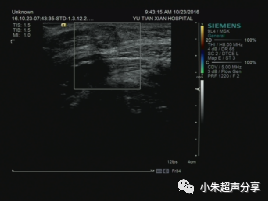型,病灶呈带状强回声伴宽大声影,内部结构显示不清,此型3例;型,低回声结节伴散在细点状钙化,此型11例;