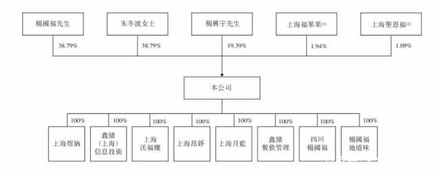 首先我们来看看杨国福的股权布局,招股书显示,杨国福及妻子朱冬波,和他们的儿子杨兴宇共持有公司近97%的股权,剩下不足3%则是分别属于员工持股平台和加盟商激励平台。其中上海福果果是员工激励平台,占股1.94%。上海圣恩福是加盟商激励平台,占股1.09%。