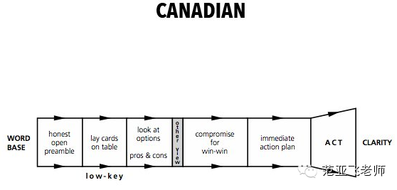 许多加拿大朋友和我的交流经历就是他们的谈话非常的民主,每个人都可以把自己的观点亮出来。他们往往不急着要做出什么决定,处事总是谨慎小心。但是我发现我的非常加拿大朋友都很讨厌浪费时间,虽然他们处事谨慎,不轻易决策;但是在开会的时候,他们往往对会议主题的走向非常敏感。“绕圈子”的宣讲方式和强硬的谈话姿态都不是很受欢迎。