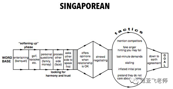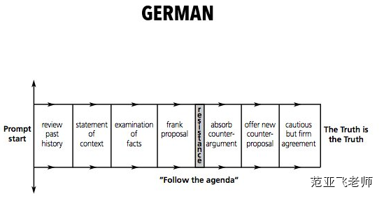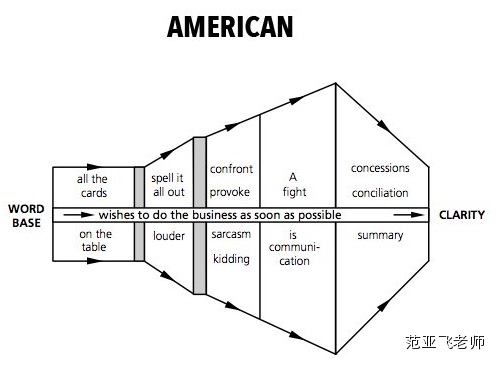 美国人常常把谈判过程看过是一个“给和拿”的游戏(a give-and-take scenario),在谈判一开始,他们就把要打的牌撇在桌子上,不喜欢绕圈子。所以他们的模式在很多中国人看起来觉得有些对抗性和攻击性。