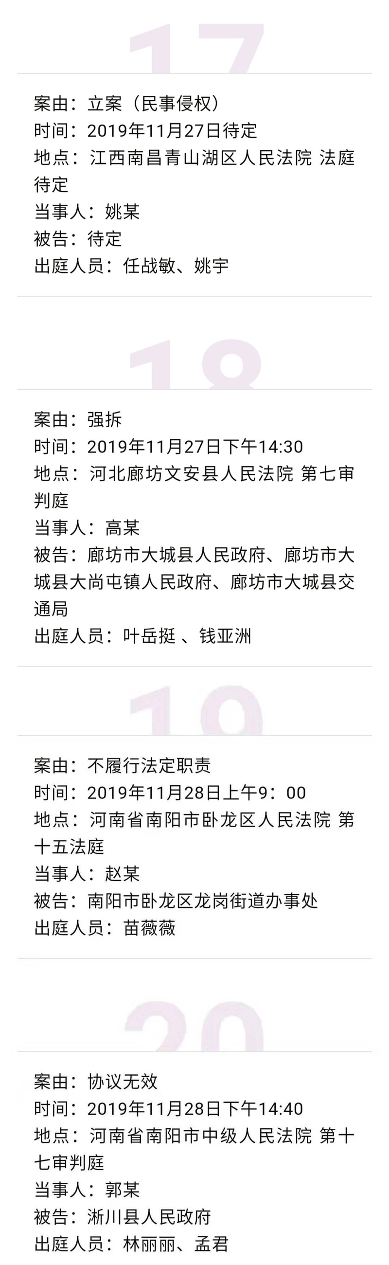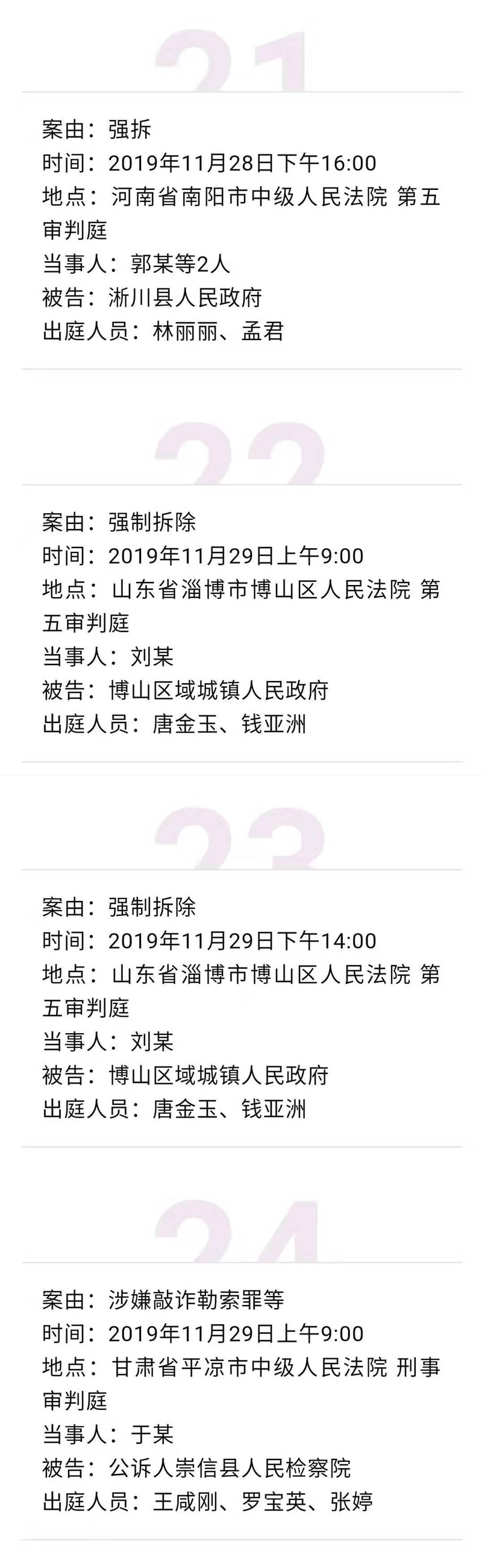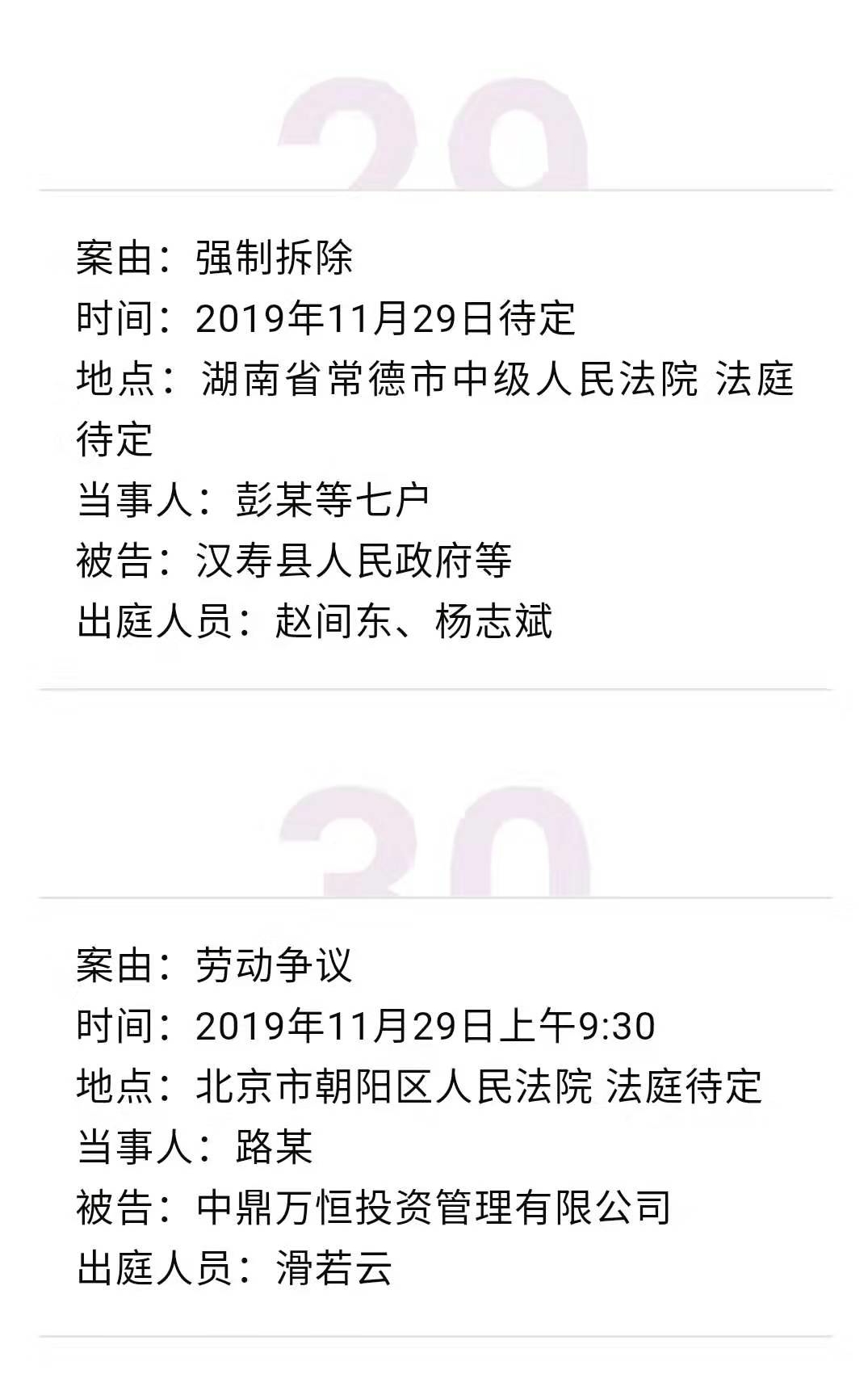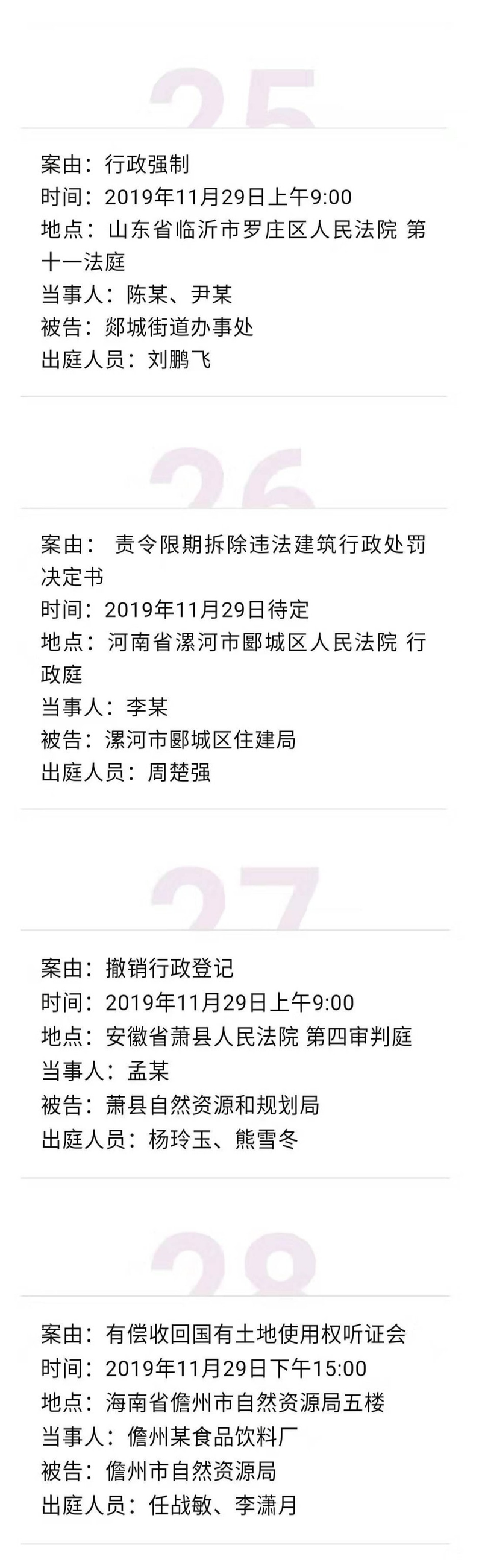 【开庭公告】冠领律师团队2019年11月25日-11月29日开庭时间表