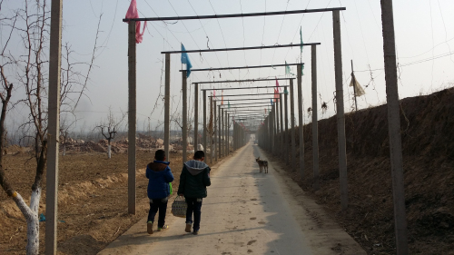 穿过蔬菜大棚,我家的狗经常在前面带路。