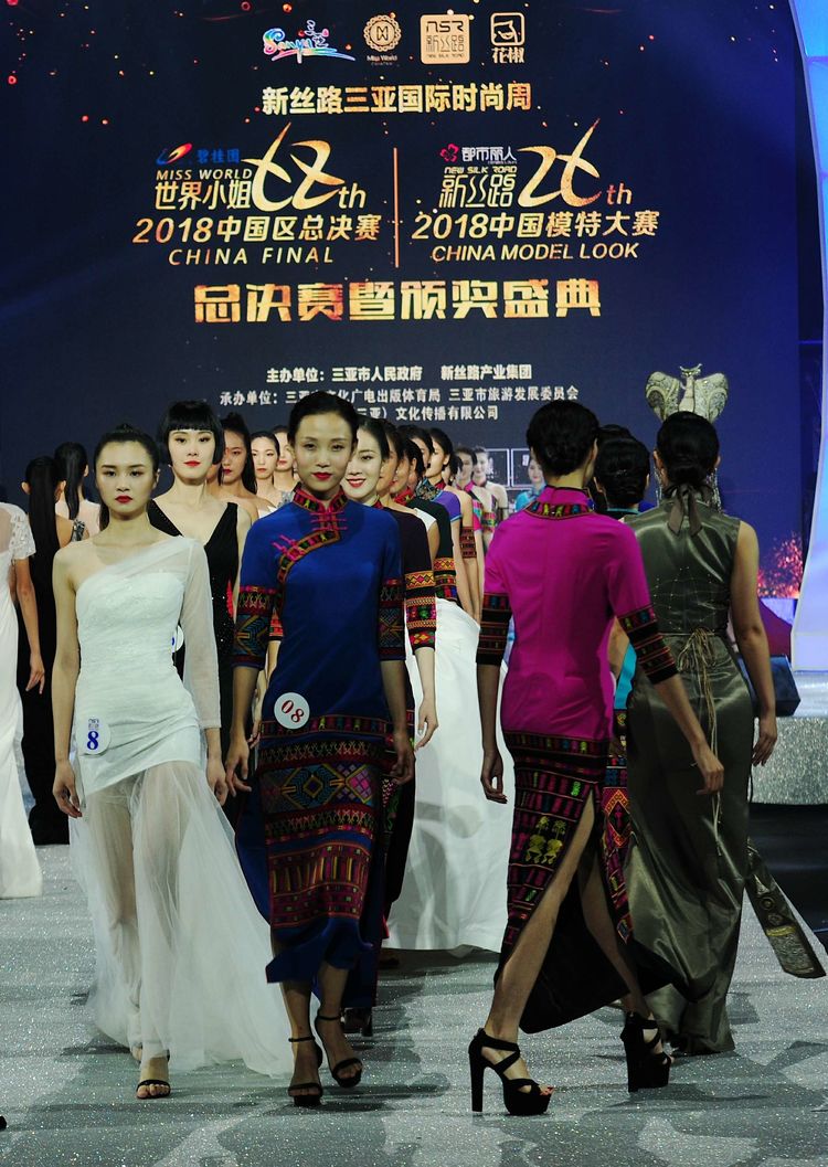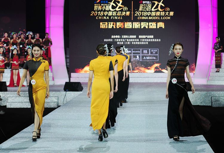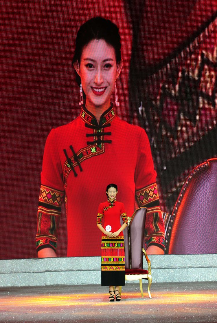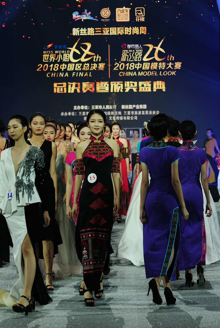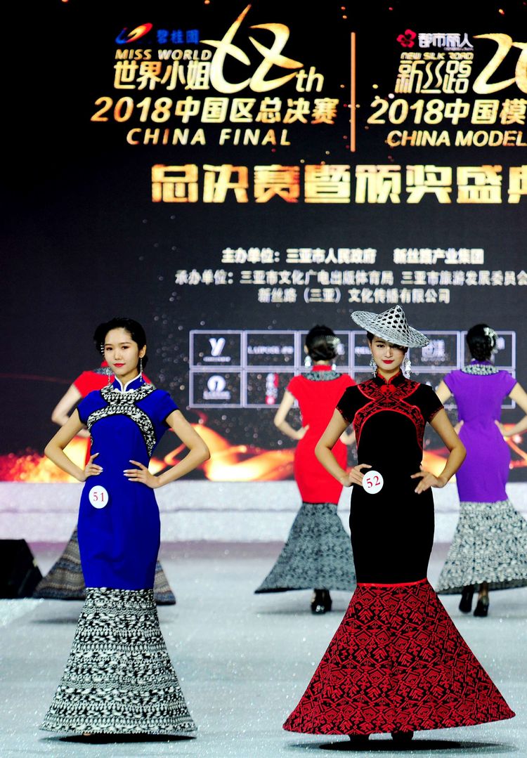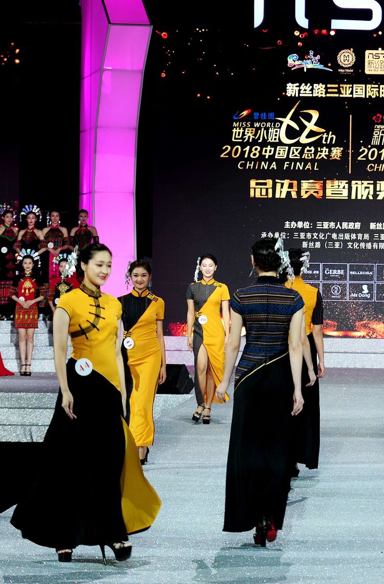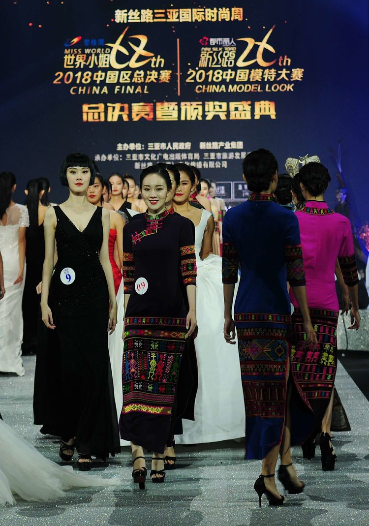 参加世界小姐中国区决赛的53名佳丽,在晚装环节身着各式黎锦旗袍,演绎了一场高水平的模特秀。