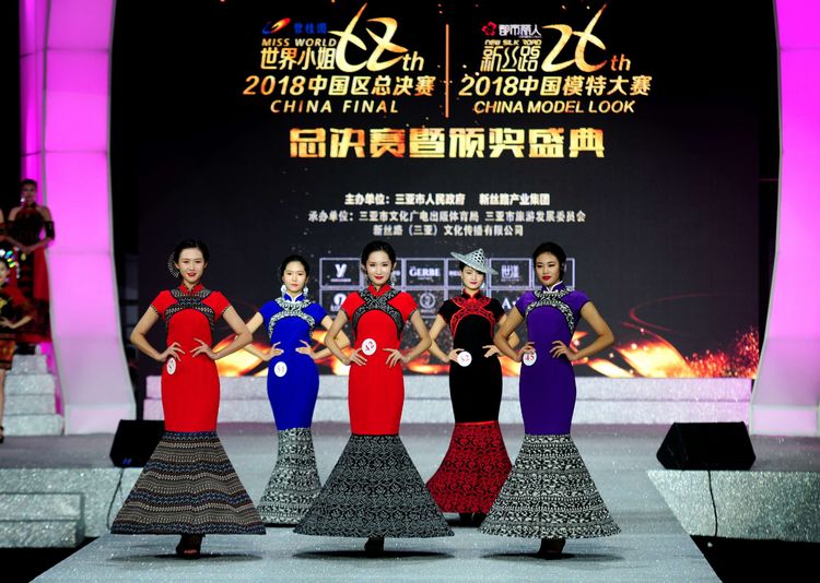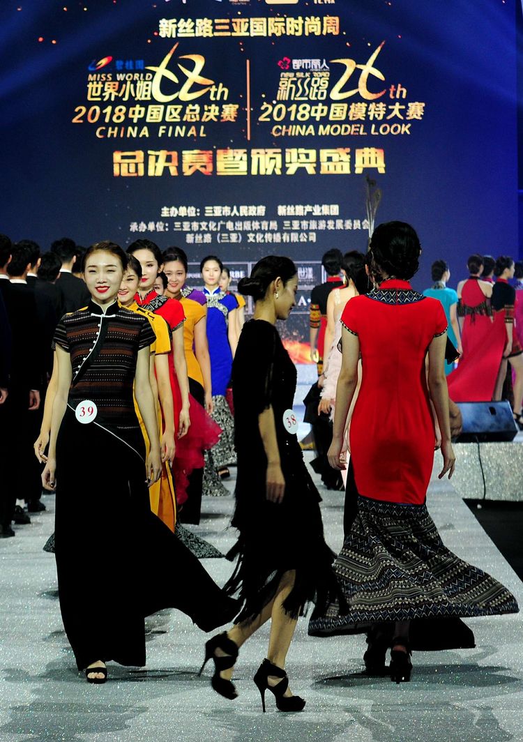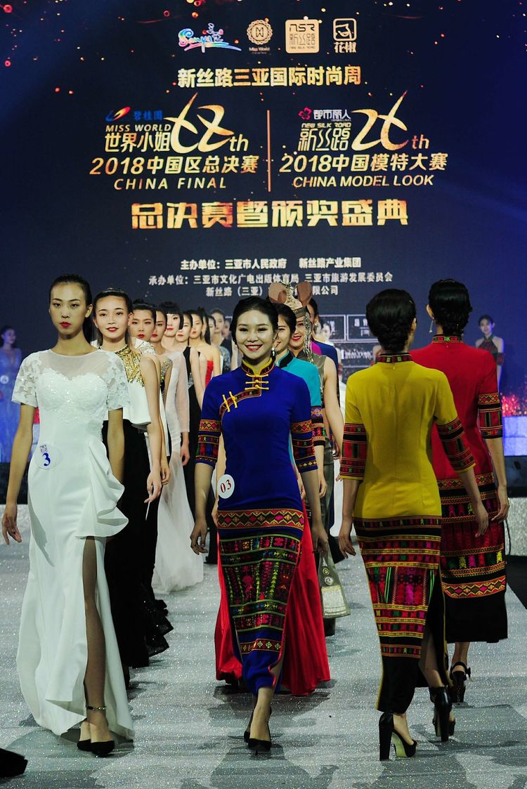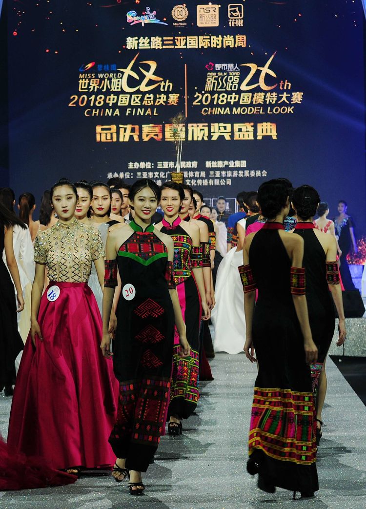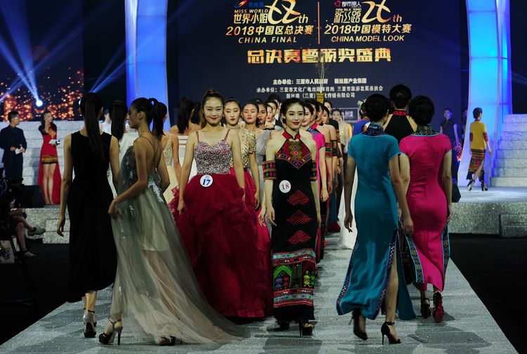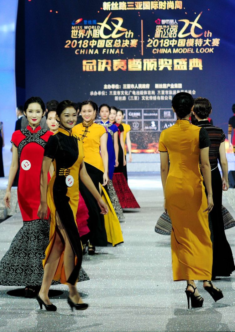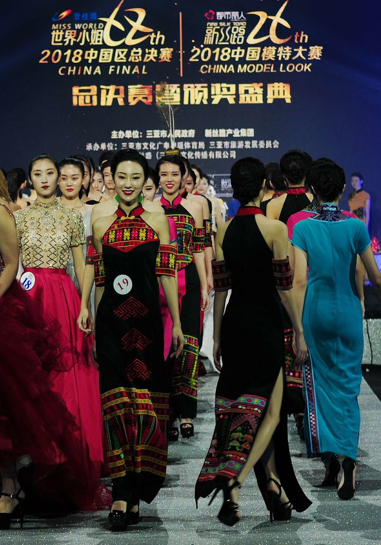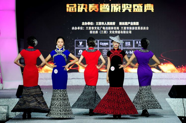 参加世界小姐中国区决赛的53名佳丽,在晚装环节身着各式黎锦旗袍,演绎了一场高水平的模特秀。