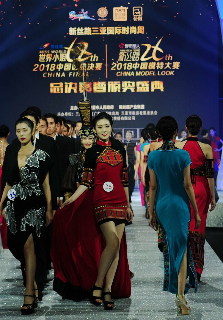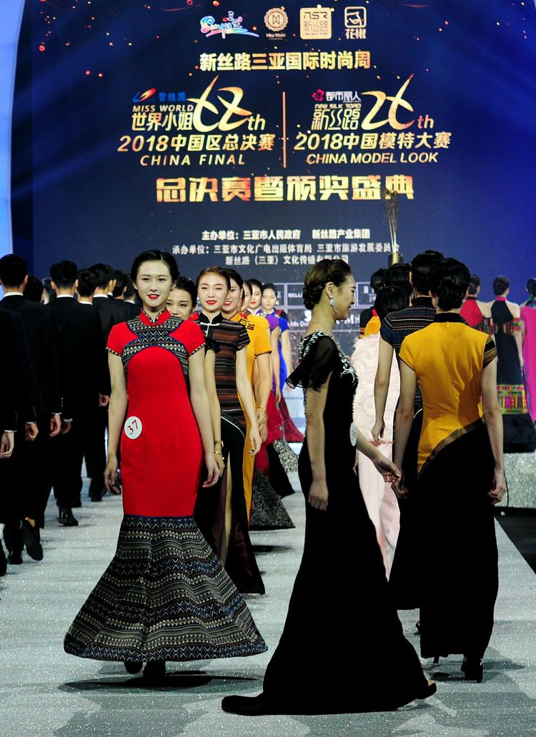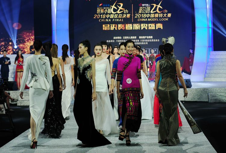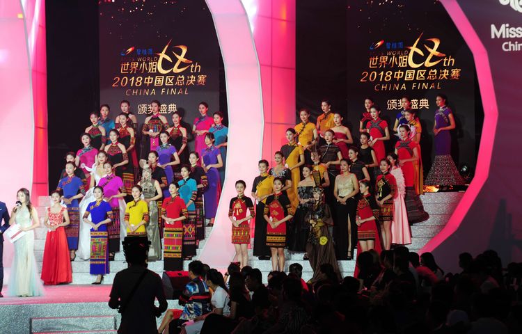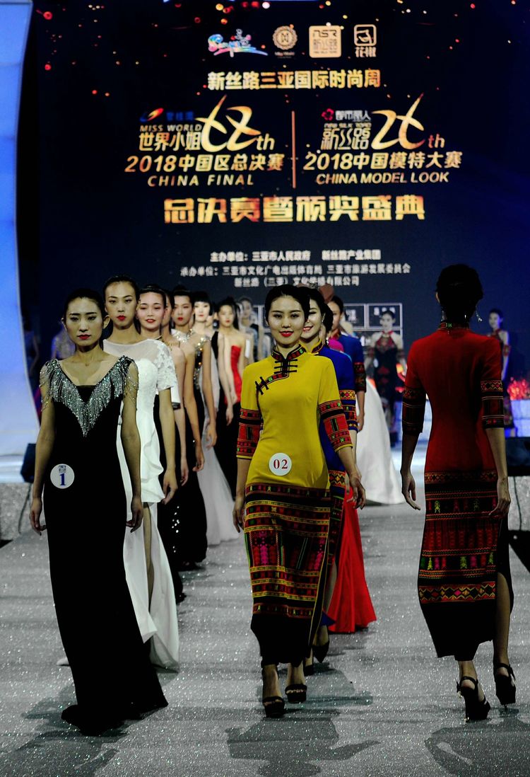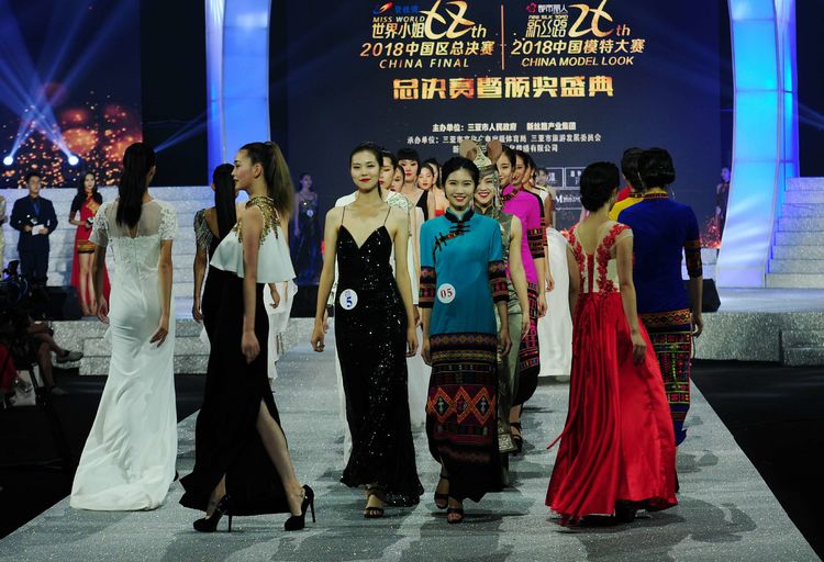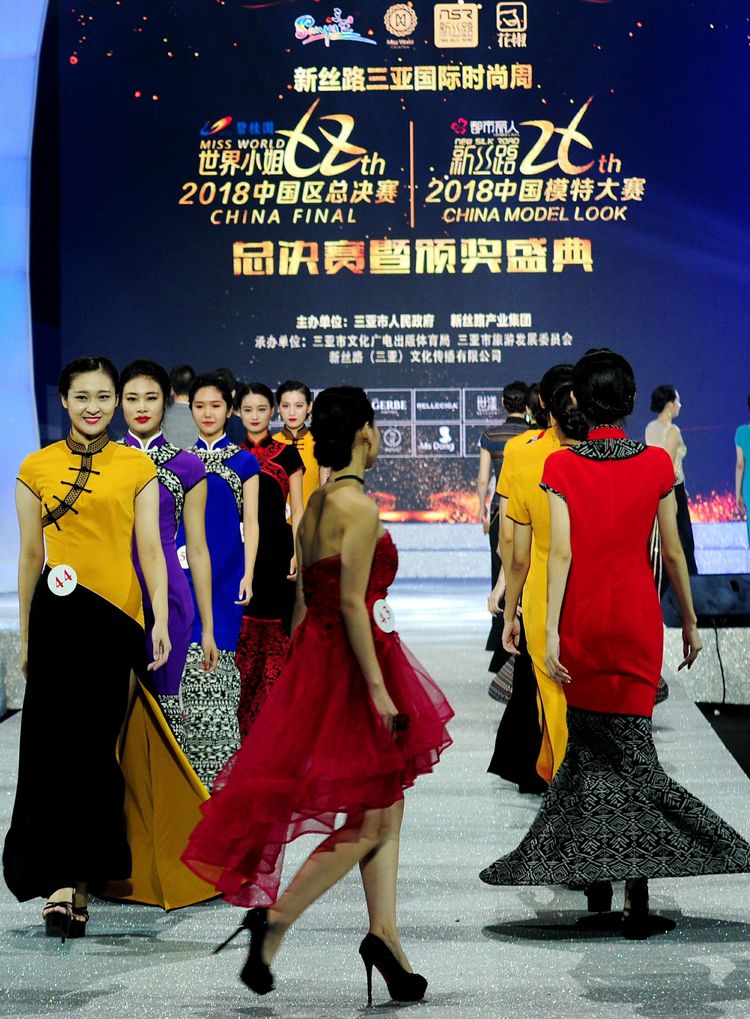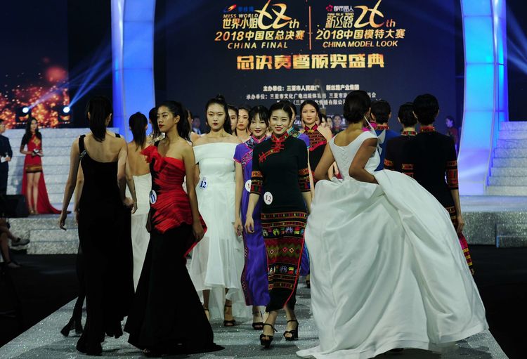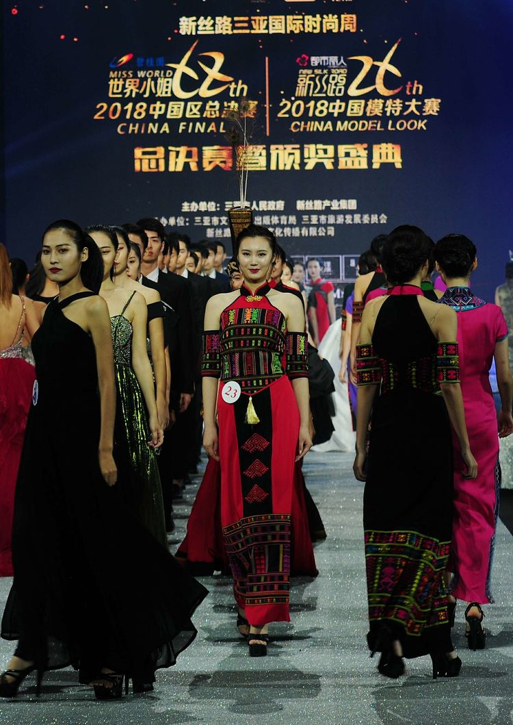 参加世界小姐中国区决赛的53名佳丽,在晚装环节身着各式黎锦旗袍,演绎了一场高水平的模特秀。