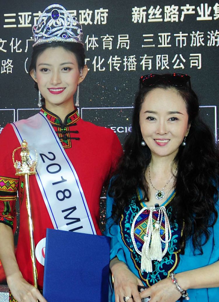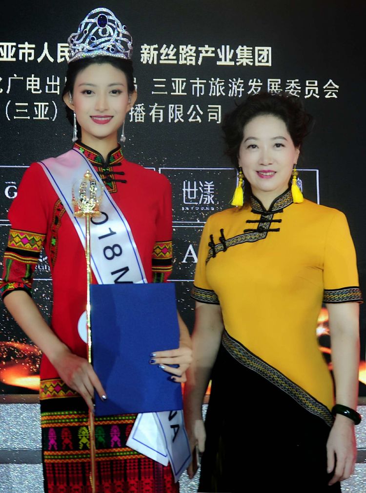大赛黎锦旗袍赞助方海南省黎族服饰文化交流协会会长汤婷与世界小姐中国区冠军合影。