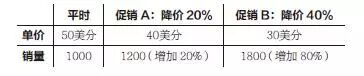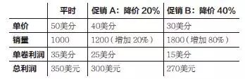 假设你负责管理一个纸巾品牌。一卷纸巾售价50美分,生产一卷纸巾的边际成本为15美分,最近你有两个促销方案,如下表: