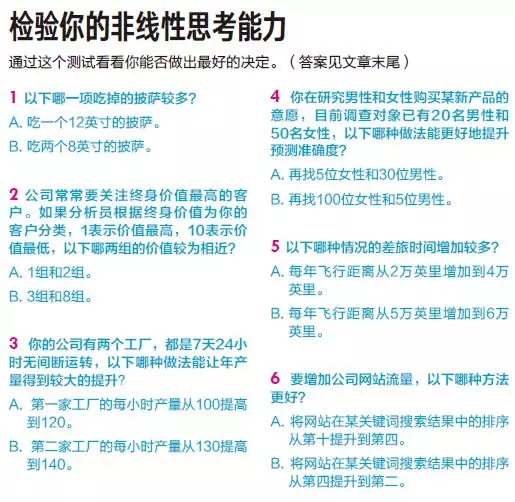MBA项目应当明确提醒未来的管理者注意这一现象,教给他们应对之法。公司也可以采取措施,比如让员工做有关非线性关系的小测试。根据我们的经验,员工会觉得这种练习有趣且有启发。