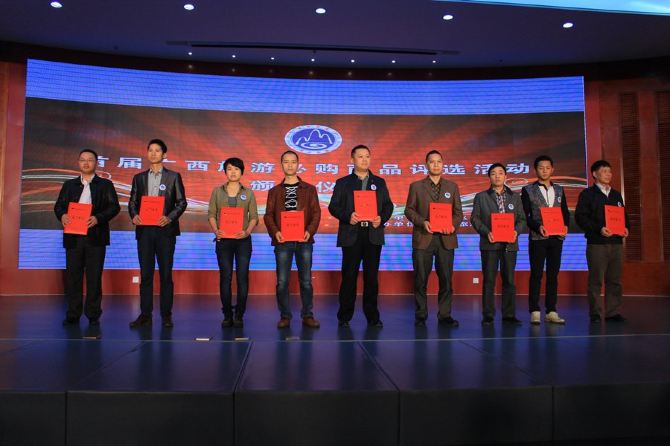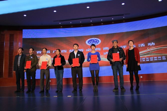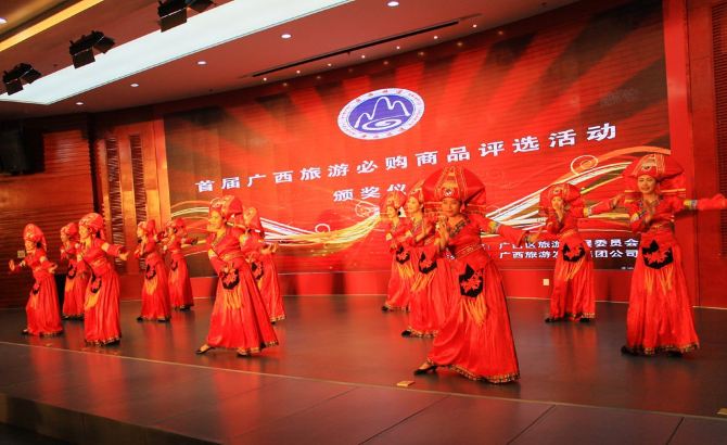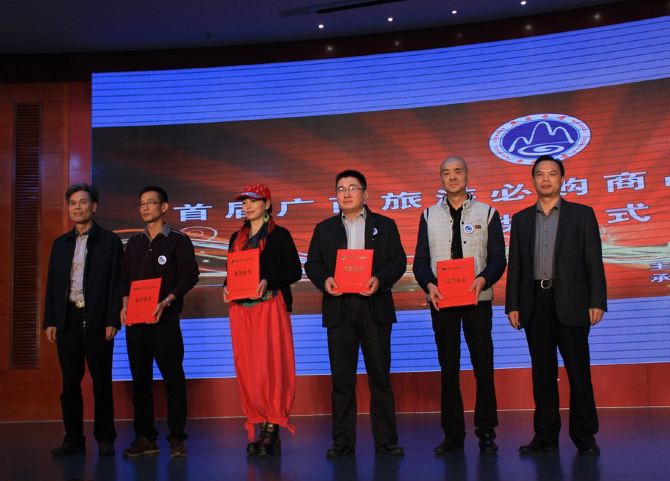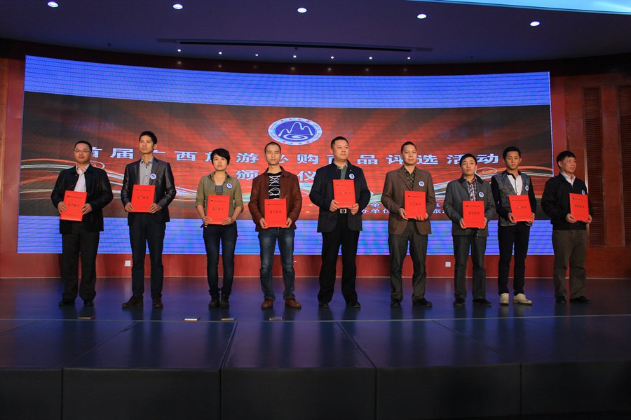 首届“广西旅游必购商品评选活动由自治区旅游发展委员会主办、广西旅游发展集团承办,”于2014年12月30日公布了结果,此次主题为“壮乡风情,尊享手礼”的评选活动共收到参评作品700多件(套),来自区内14个市的213家从事旅游商品研发的专业机构、高等院校、旅游商品生产厂家及旅游商品经销单位选送产品参加评选。根据评选活动专家评委会对众多参评作品进行初评、复评、终评以及公众网络投票评选,经活动组委会办公室审定,最终获奖商品包括休闲养生食品类18个、旅游工艺品类6个、旅游纪念品类10个、旅游文化品类6个、旅游民俗工艺品类8个、旅游日用品类4个,共6大类52个商品。当天,自治区旅发委副主任赖富强,自治区旅游商品展示中心主任陈潮冬等给获奖的企业代表颁发了荣誉证书。