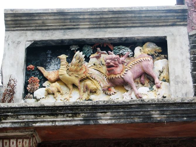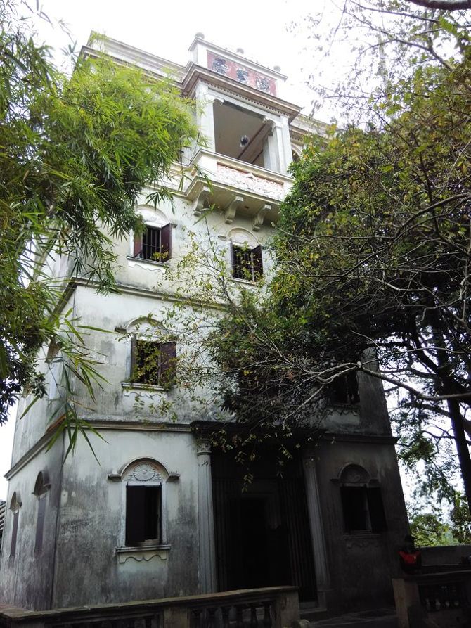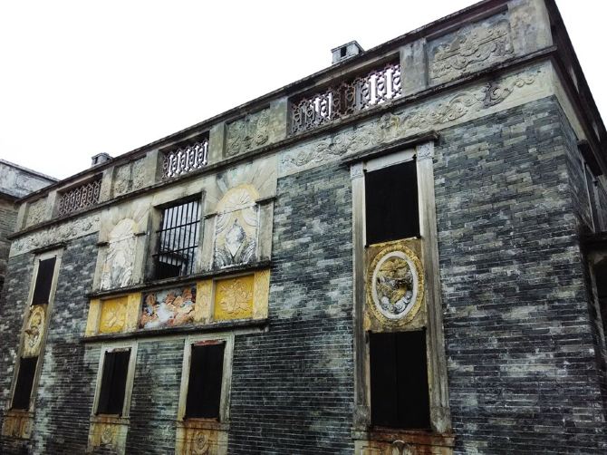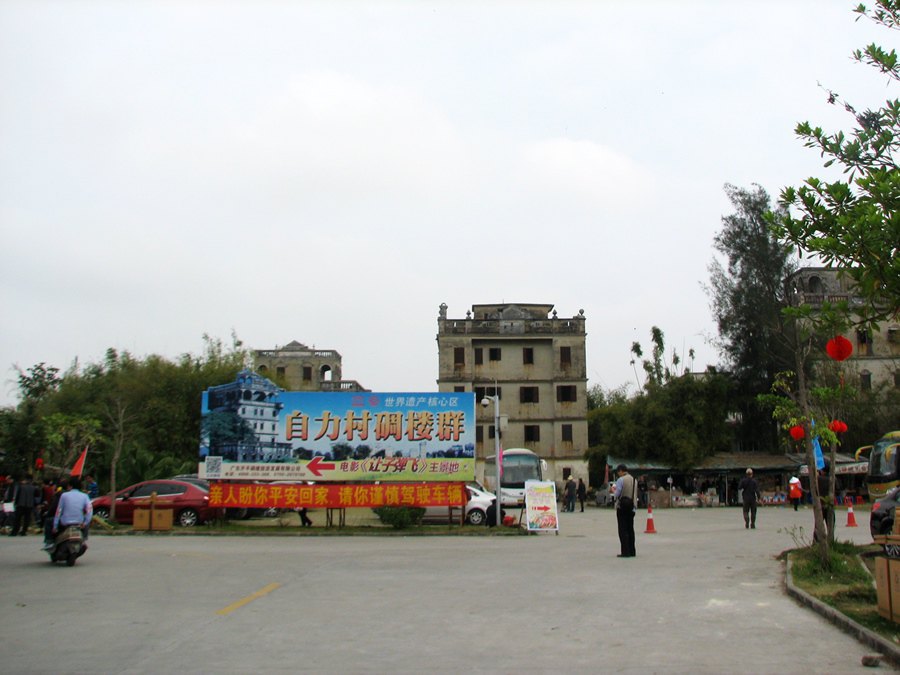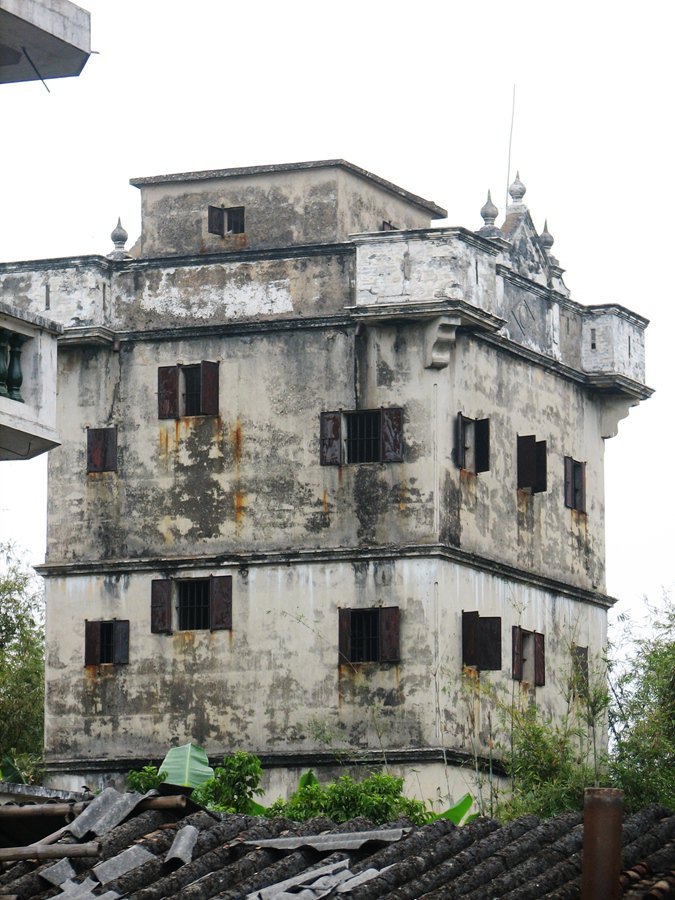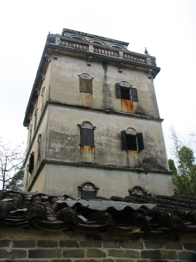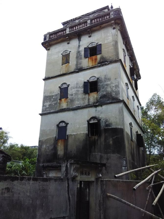 因为我坐4路公交车到自力村,车只在村口上下客,从村口走进村里看雕楼还有差不多1公里路,我走了半小时,浪费时间啊,等我走到村里景区入口已经12点20了。整个开平有1833座碉楼,就从村口走进来的路上,也有很多零散的碉楼,村口的停车场有大大的指示牌,这里的几座5层高碉楼因为不是游览点的,所以没有修缮的感觉,铁窗已经生锈,导致墙壁锈迹斑斑,但是外墙的厚实坚固、楼顶的独特造型看起来还是很雄伟的,这坚实的外墙完全可以抵御土匪的攻打了。面对这些斑驳的碉楼,仿佛时间回到了民初。这些没开发的碉楼,其实也可以登楼参观,只需要给五元钱,主人就会让你上去了。不过门票包括了可以登楼的,所以我没有在这里上去。
