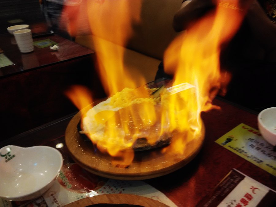 火烧了后很有口感,没有酒味的,不过建议大家因为是铁板的牛排,如果你平时吃6成熟的,大家点的时候最好要5成就好了,要不一边吃一边会越来越熟的哦。