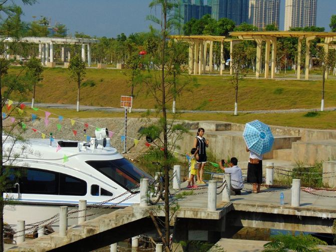 苍海中心广场湖边的这艘游艇成为游客拍照的目标