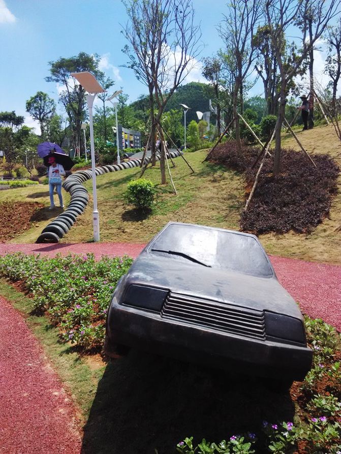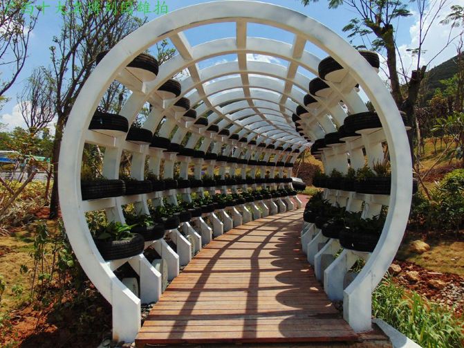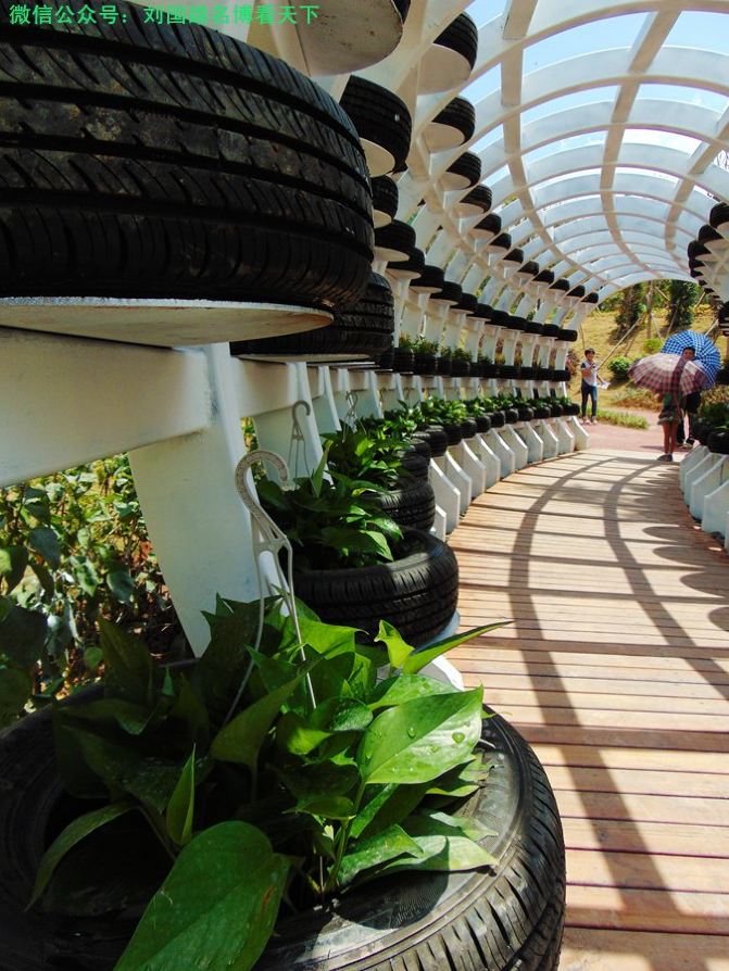 柳州馆突出汽车工业,这是轮胎做的盆景长廊