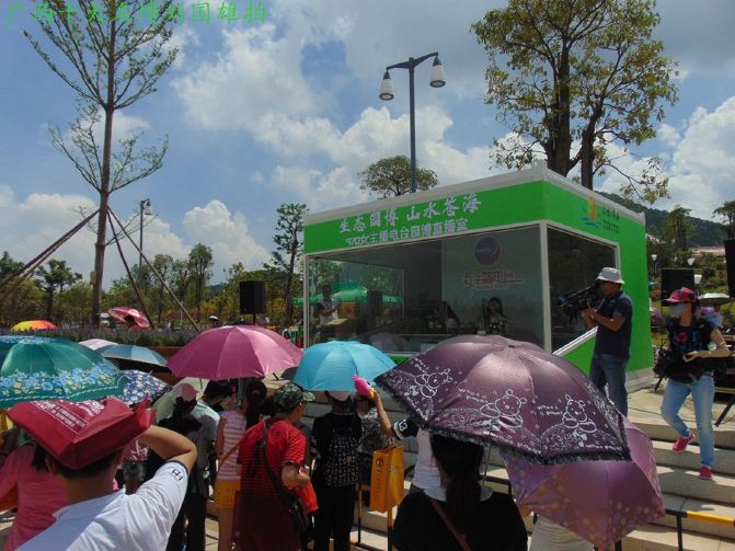 我们从苍海展示中心看完广场汇演和参观中心的展示厅之后,坐上园区的观光车,来到游船码头,坐古色古香的木游船到对面的园博会园区参观。远远看到对岸的梧州园博园主展馆和970女主播电台为此次专门设立的直播室。下船后看到很多游客、听众围着玻璃透明的直播室前,看菠萝女主播项阳和葡萄女主播黄瑶的直播,这次970女主播电台少有的派出4位当家女主播亲临现场,为大家播报园博资讯并亲密互动,开展有奖竞猜等活动,新颖的宣传模式吸引了多粉丝高高的举起了相机和手机不停拍照,他们希望能留住这美好的时刻!970女主播电台副总监宋扬说,这个透明直播室将一直保留在园博会,将成为园区一景。