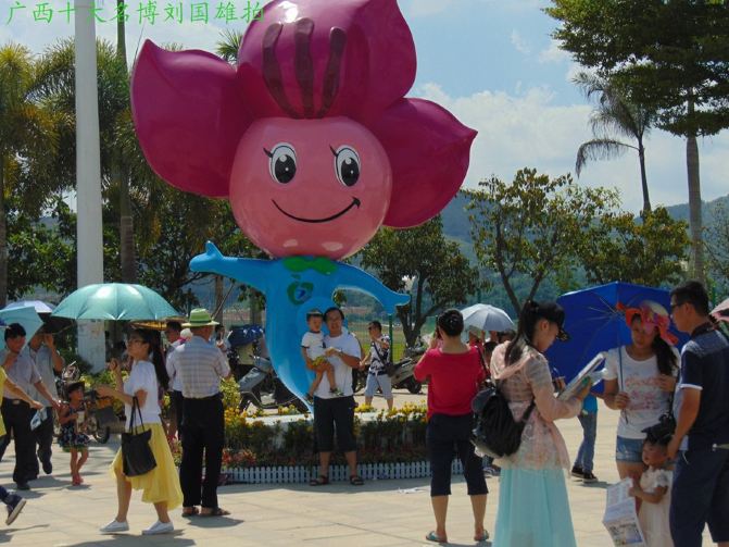 园博会吉祥物“宝宝”吸引游客留影,宝宝是以第六届广西园博会的举办地梧州市市花——宝巾花为原型来进行创作,宝巾花又俗称三角梅、毛宝巾,代表梧州独具特色的人文景观、文化底蕴和精神风貌。