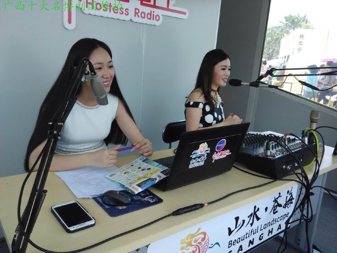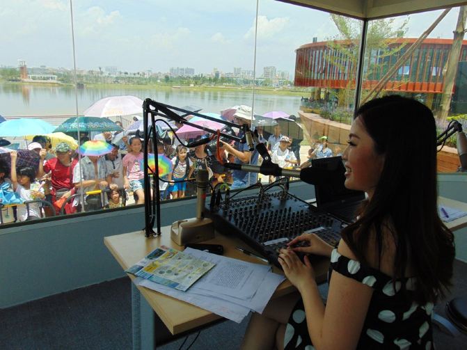 FM970女主播电台在梧州园博园现场设立的直播室引得游人驻足