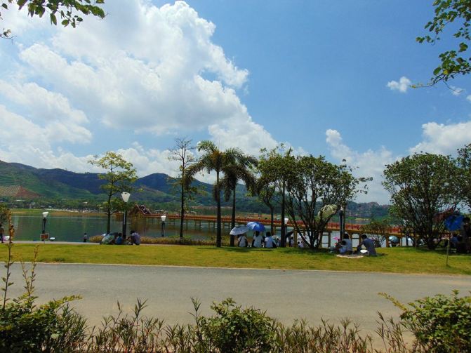 我们从苍海展示中心出来,坐观光车去码头,一路上看到很多游客在湖边树下看风景