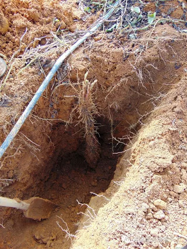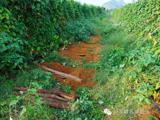另一种是定向种植,种植的紫玉淮山是横向生长的,所以叶子是用架子搭着长的,根有“托盘”托着,挖起来容易很多。