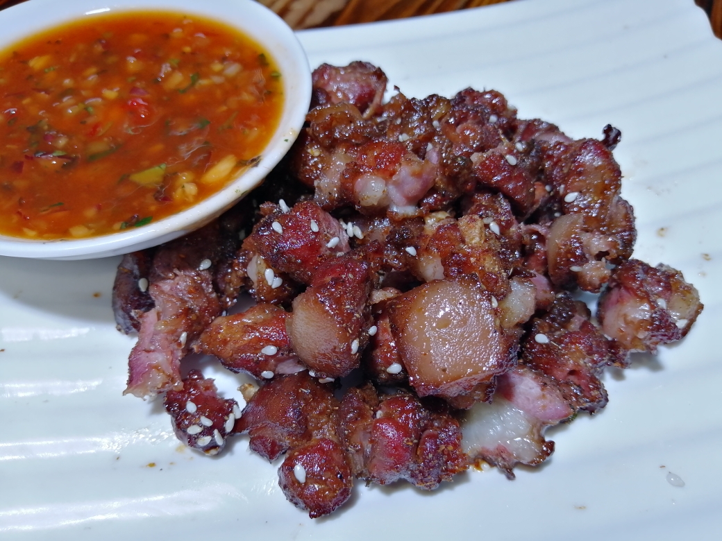 烤猪眼是广西百色那边的特色,没想到现在南宁也很多了,这烤猪眼外焦里嫩,还咬一口就爆浆,那个口感就是爽啊;烤鸡屁股其实有一个好听的名字,叫烤凤尾,烤好的烤凤尾没有骚味的,油嫩光亮,外表酥脆,里面肉质很鲜嫩哦;椒盐竹虫也是下酒神器,竹虫就是“笋蛆”,有点像蜂蛹,但通体白色,酥炸后跟干辣椒、韭菜一起炒,竹虫看起来可怕,吃起来香酥可口,微微的椒盐辣味让人很上瘾,我们可是吃了两碟哦。