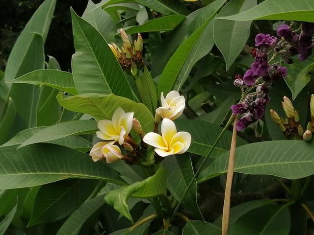 除了荷花,岸边也有盛开的鸡蛋花,远处是荷净桥