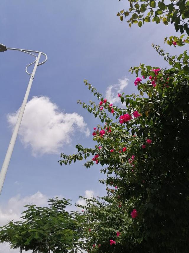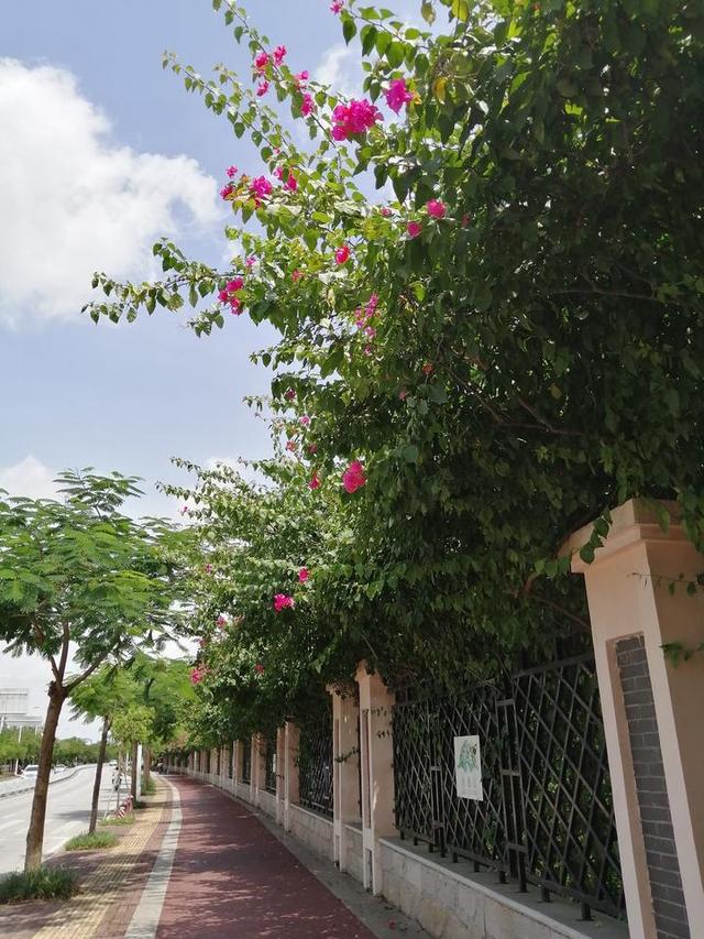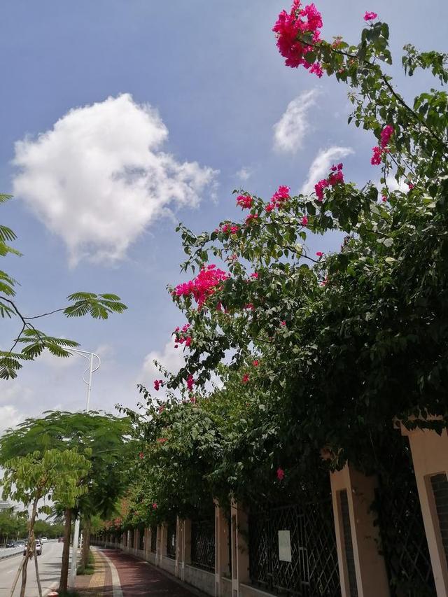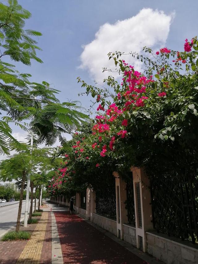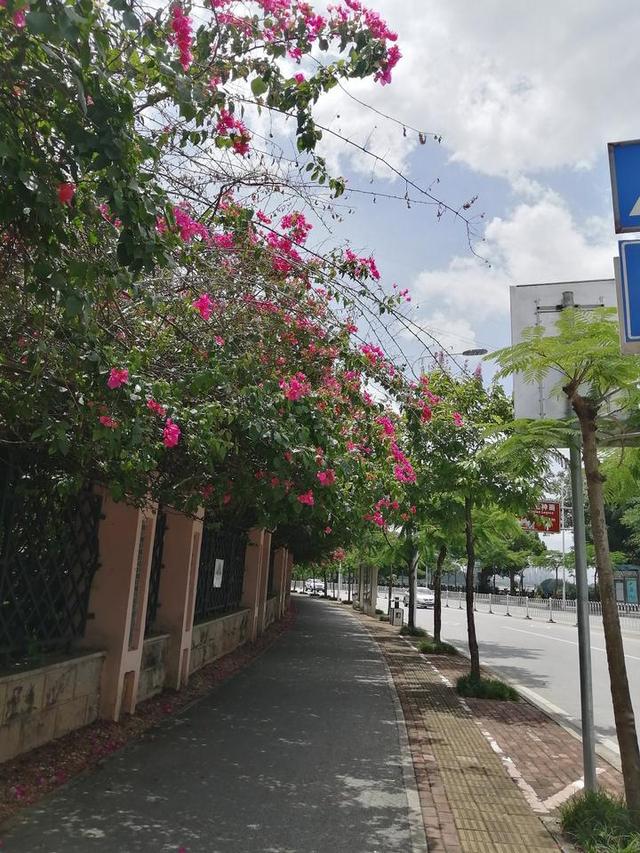 我端午节期间去孔庙参加活动,从孔庙出来,就被这高高的三角梅吸引。孔庙至青秀山南门的三角梅,没有西段那么密集,叶子少一些,花也没有开那么多,但是因道路弯曲,绿化树遮挡影响小,所以拍摄出来的照片会带有明显的线条感。