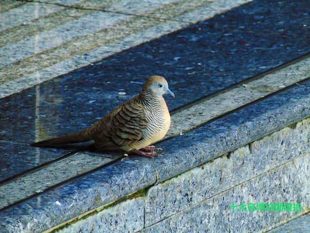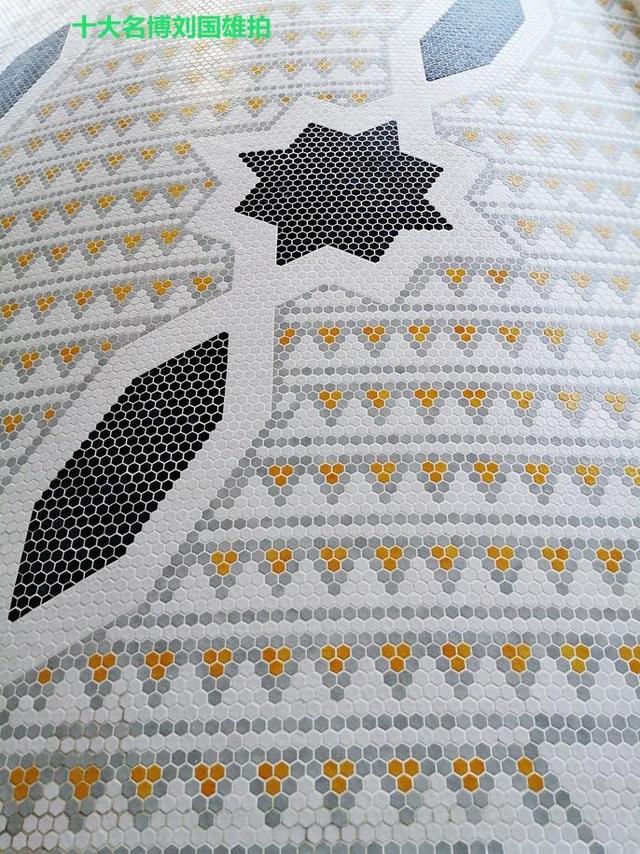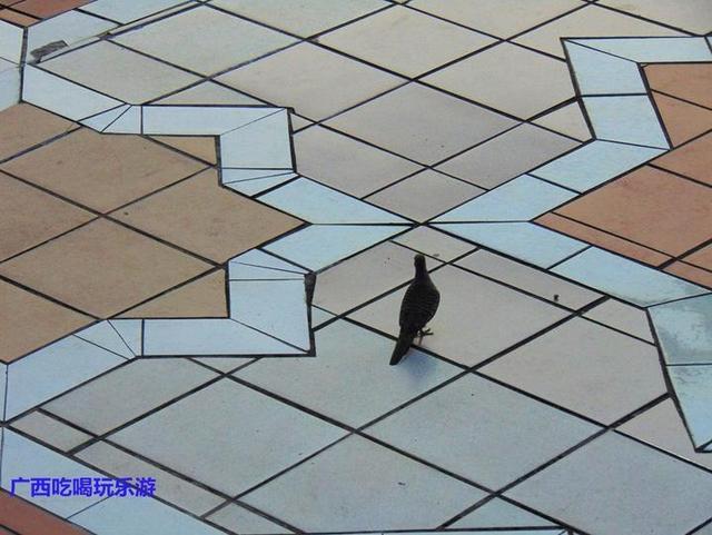 这里对开的地面铺了瓷砖,地砖的八角星拼花和湛蓝的天空形成强烈的对比,关键是看到下方有个鸟儿