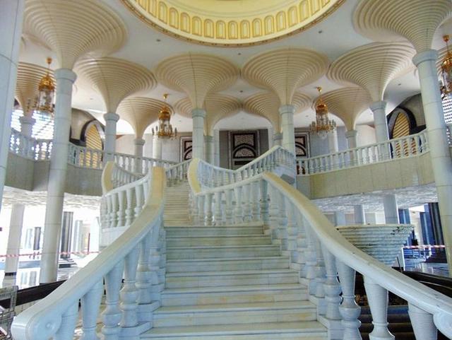 脱了鞋子走进一层,看到不同方向都有楼梯上去,上到大厅,看到眼前的景象,不由得惊叹,杰米清真寺不愧是文莱全国最大、最豪华以及最现代化的回教堂,大厅的色调以白色为主,白色基调显得庄严大气,一排排白色的大柱子错落有致,据说这些柱子全部是意大利出产的一级大理石,柱子的上方是一圈圈往上淡黄色的“圆伞”,支撑着顶部。中间的穹顶的精致艳丽,顶部还有很多奢华的水晶吊灯,一切都是如此的富丽堂皇。