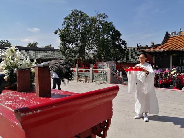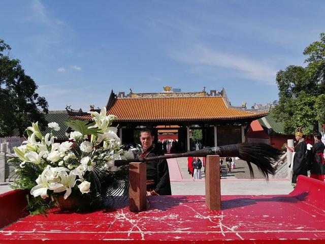 过了状元桥,再走过大成门,来到大成殿广场,赍笔入案。接着,学子和师者代表,赍捧高香、花篮和水果,敬献孔子。随后,祭司宣读祭文,全体参礼人员及观礼人员向先师孔子行三拜礼。自此,祭孔仪式完成,大家到乡贤祠准备进行开笔仪式。