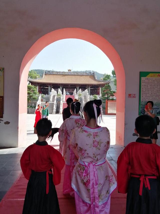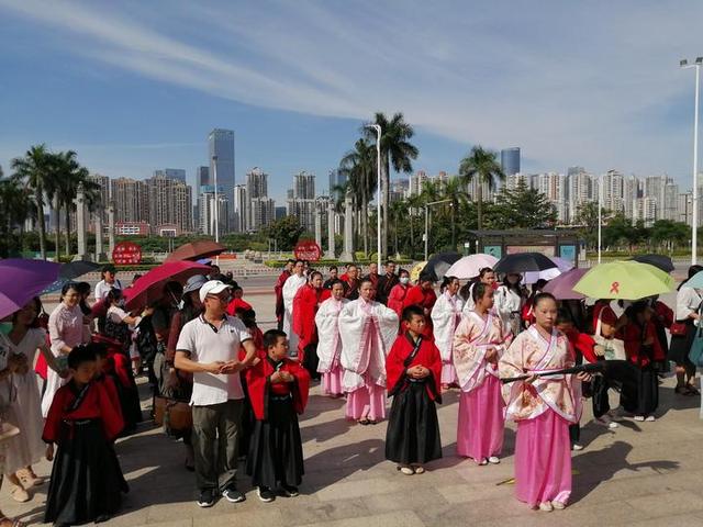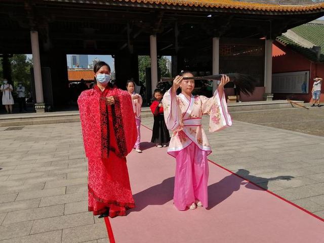 在孔庙广场,参加启智开笔礼的老师和学童都身穿汉服