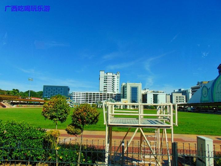 站在喷泉池旁边,看我们的旅游大巴和草坪那边的楼房