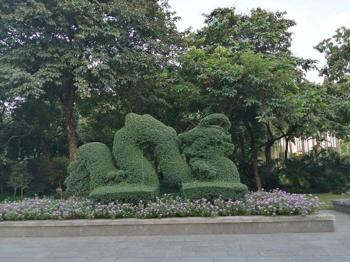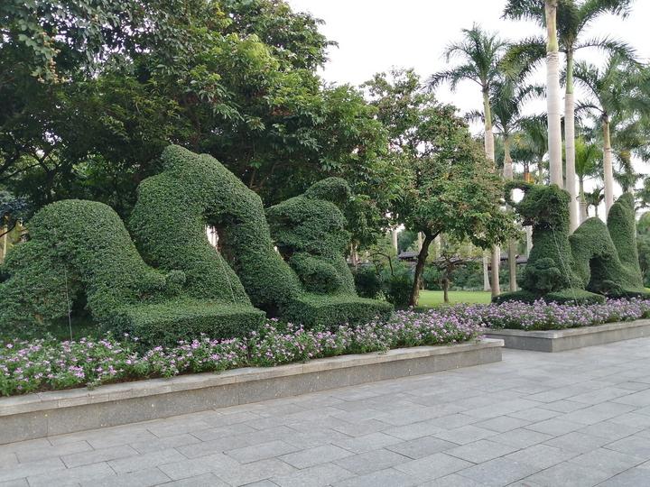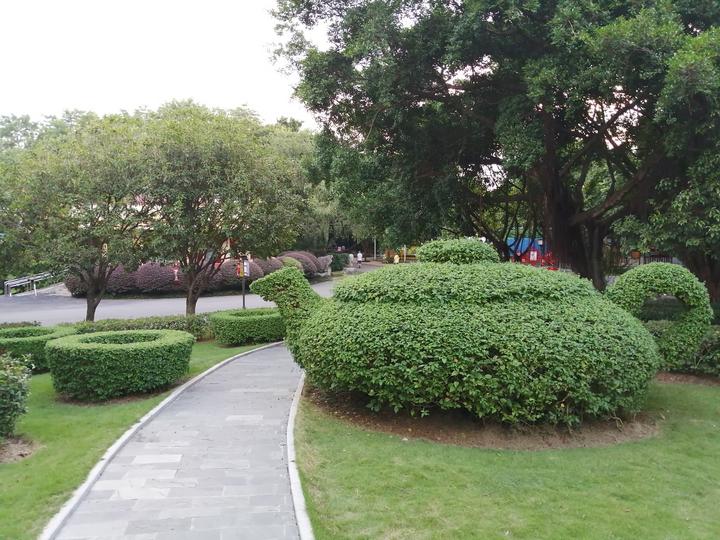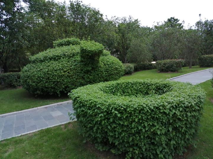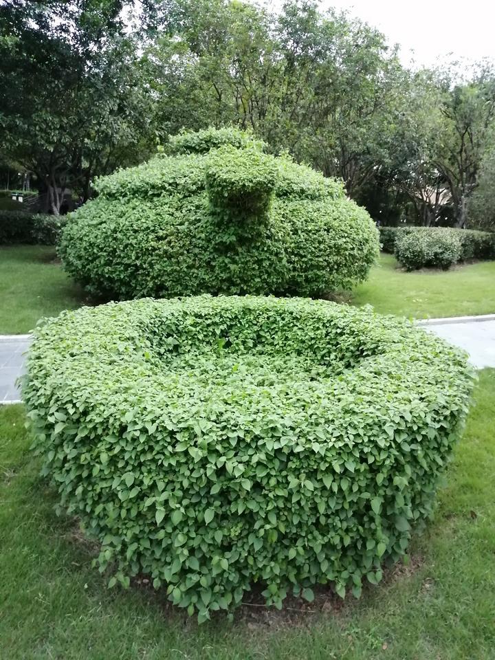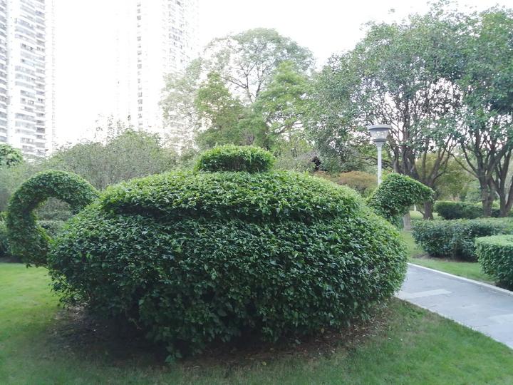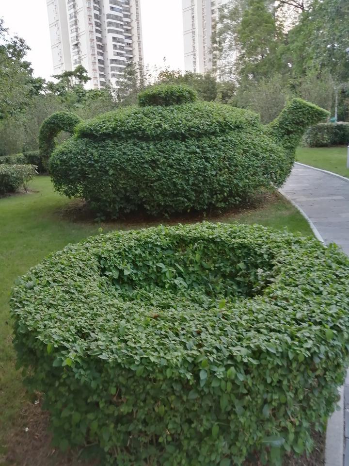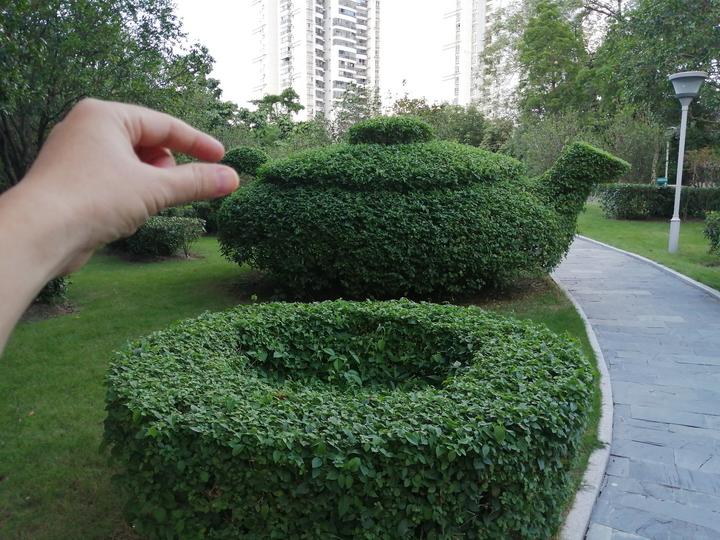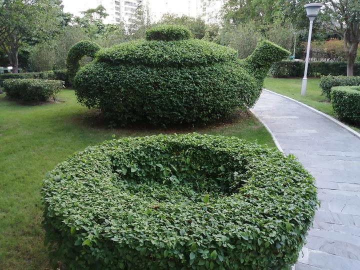 比如在金花茶公园深处的这个绿色的大“茶壶”,还有壶前边的几个茶杯,都是“引导”植物长成这样的,然后定期修剪,做得真的很逼真哦。