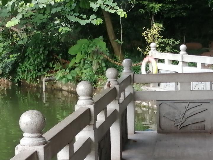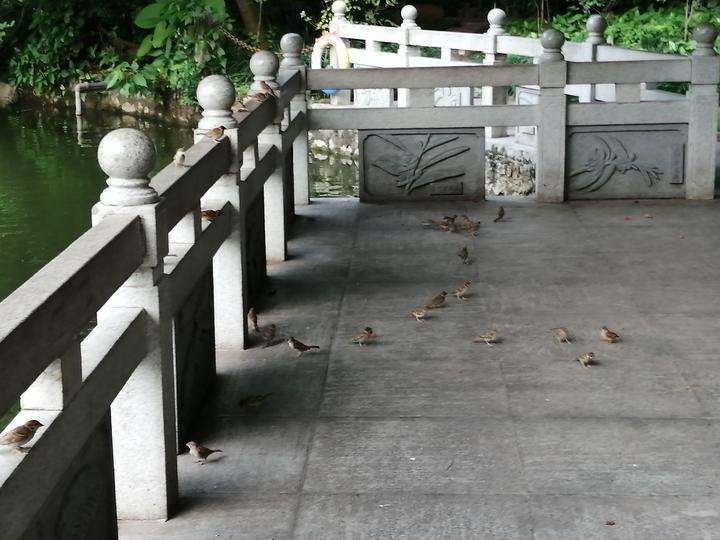 在金花茶公园西门的湖边,经常看到很多人在喂金鱼,这里的鱼很大、很多。我也经常看到这里有成群结对的麻雀在地上玩,人来了才往枝头上飞,让人感觉这个城市中心的公园生态保护真好。