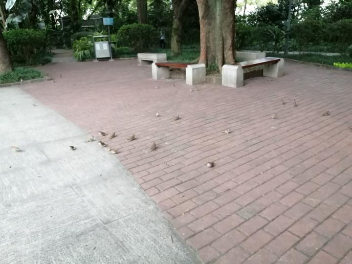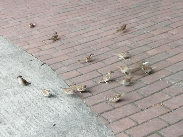 原本很多人都是把面包喂金鱼,有一天有人把面包丢到地上,没想到引来了一大群麻雀,这些野生的麻雀很活泼、不怕人,面包一丢下去,就直接抢着吃,特别好玩。