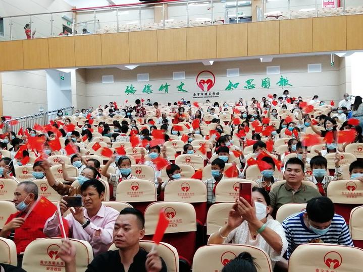 刚刚获得“中意青少年文化交流使者”称号的林美伊带来了少儿独唱《一抹桃花》;国家一级歌唱家鲍朝志除了演唱《不老的爸爸》外,还深情地朗诵了诗歌《祖国是什么》;广西壮族民歌歌后黄春艳和陈明珍老师的山歌合唱《壮美春江水》美如天籁;广西著名笑星光光的歌曲《爱笑一家人》掀起了活动的高潮;广西民建艺术团副团长卫东的歌曲《鼠我第一》让现场掌声不断;来自广西歌舞剧院的谭李陈除了独唱《中国力量》外,还和谷潇潇老师共同演唱了抗疫歌曲《情牵天下》。值得一提的是,14岁的励志盲童女孩易美炫带来了一首让现场观众感动共鸣的《感恩的心》。精彩的文艺节目让孩子们的笑声此起彼伏、掌声不断。