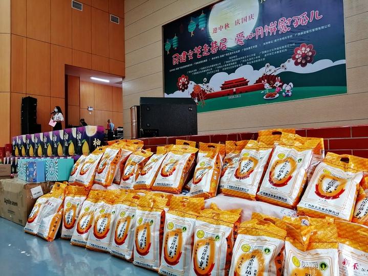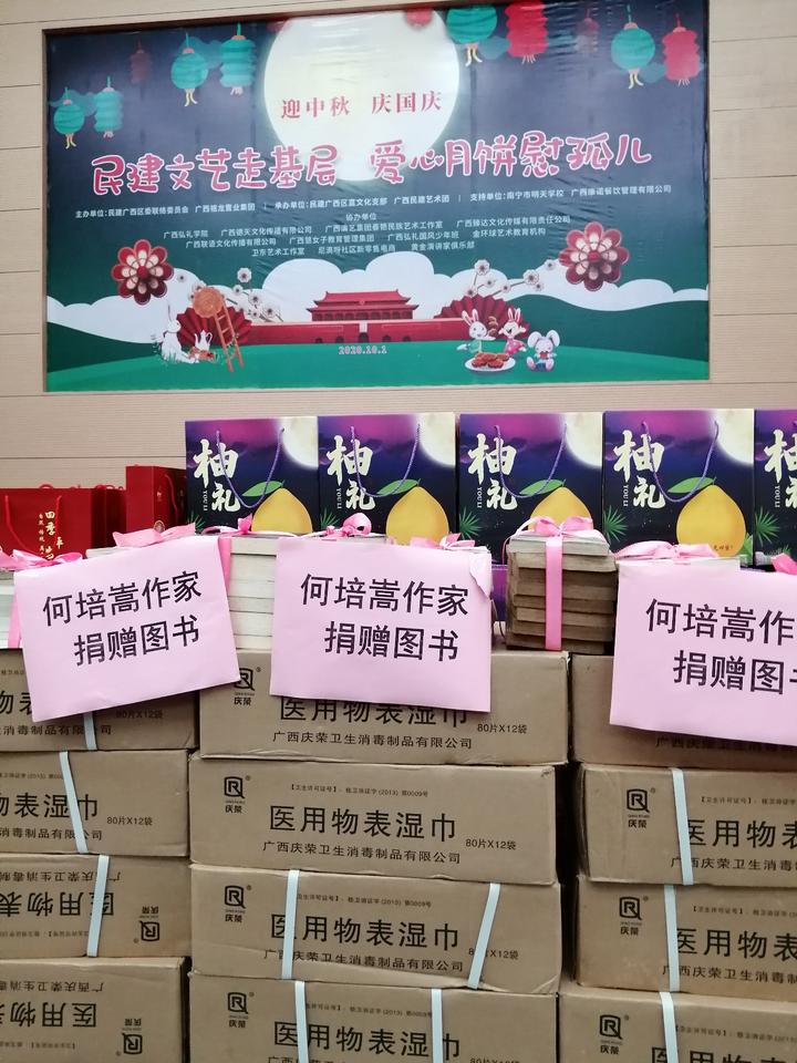 这是民建广西人连续12年策划组织社会爱心人士到广西第一所孤儿学校——南宁市明天学校开展爱心慰问活动了。该活动由民建广西区委对外联络委员会主任、广西民建艺术团团长林涌泉担任总策划、总导演,广西民建艺术团著名笑星主持人光光主持。广西祖龙置业集团、广西康诺餐饮管理有限公司共捐赠了总价值数万元的爱心月饼。民建广西区直文化支部、广西弘礼学院、广西慧女子教育管理集团、广西臻达文化传媒有限责任公司、广西健云科技有限公司、广西联语文化传播有限公司等爱心机构及爱心企业共捐赠了大米115袋(10斤/袋)、文具盲盒300盒、红心柚35箱、医用湿巾12件等爱心物品。著名作家何培嵩捐赠了《明天的太阳》《哭了笑了》等爱心书籍一批。广西民建知名画家、金环球艺术教育机构负责人黄环球专门为南宁市明天学校创作了一幅题为《奋斗与希望》的水彩画,并现场捐赠。