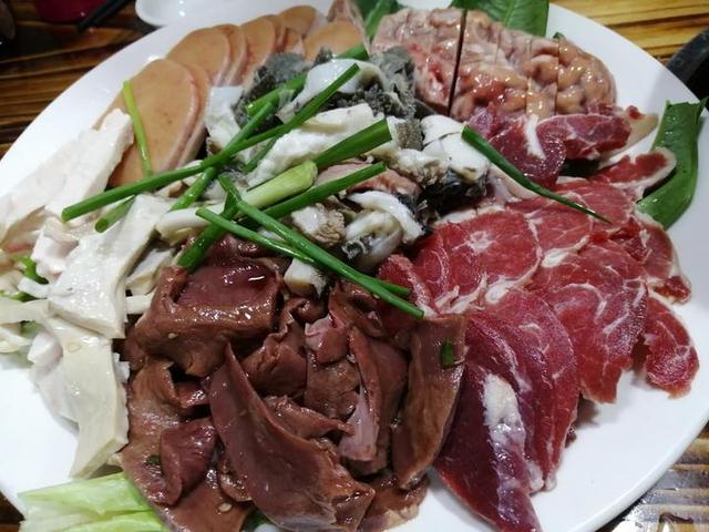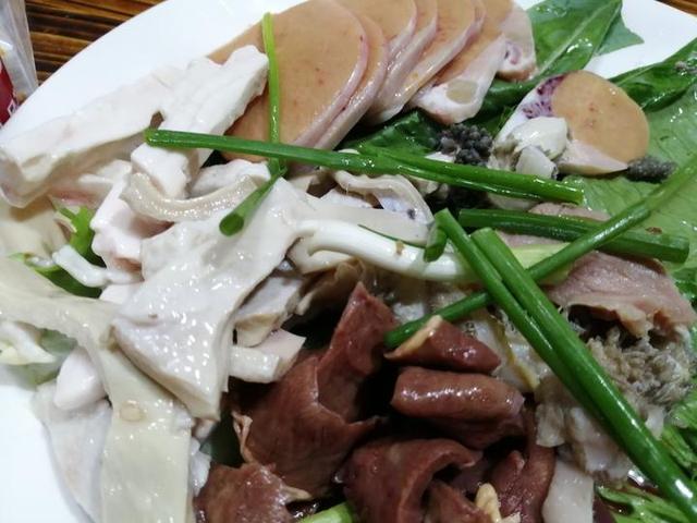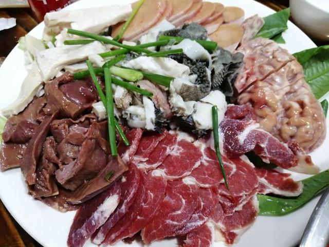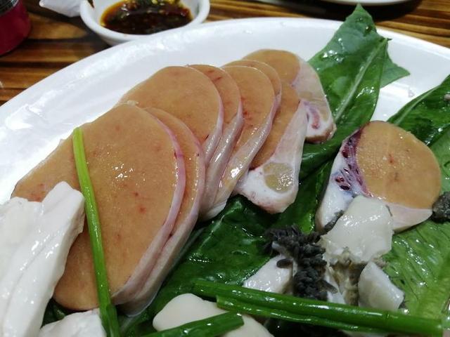 我们就选了附近的乡村小厨吃饭,看到别人吃的酸汤牛八宝火锅,感觉很不错。于是也要了这个火锅,以为是跟贵州的酸汤火锅是一样的。没想到,这里的酸汤不是贵州凯里的那种,是用广西特产酸笋,以及酸辣椒、姜丝、辣椒油等做的,汤底还有黑豆腐(或者是魔芋),嫩嫩的,酸辣汤味道真不错,跟贵州酸汤比是另一种风味。这一锅才98元,一碟牛八宝里有牛肉,牛百叶,牛骨髓、牛肚,牛肝,牛黄喉,牛脑等,关键是有牛蛋,这东西难得吃到啊。虽然牛八宝是冰过的,但是烫着吃,口感一样的鲜,脆。就是吃到最后放青菜了,还是汤和里面的配菜味道都不变,厉害了。
