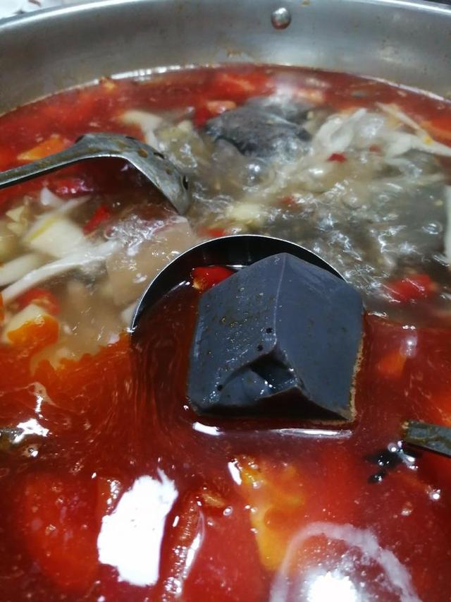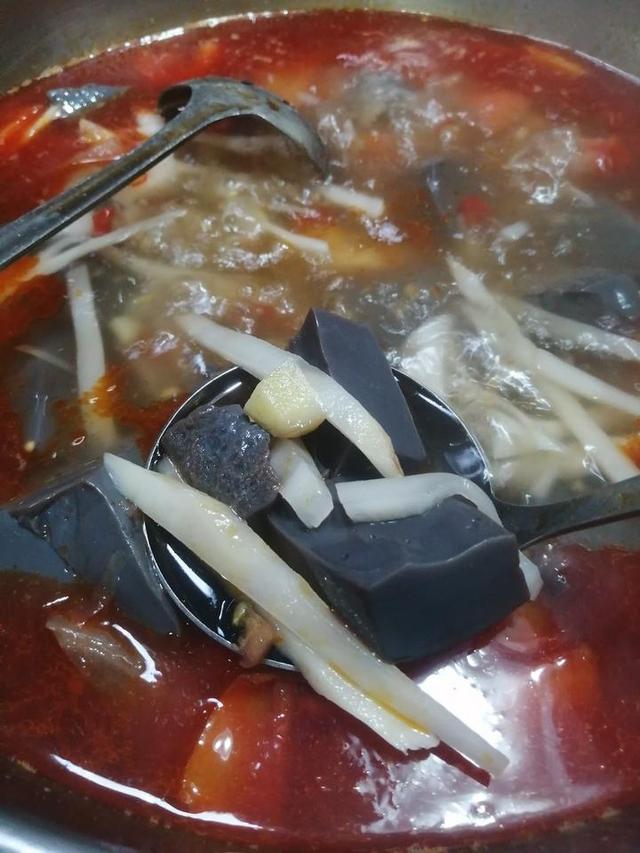 开吃,一直没弄懂锅底的这个是黑豆腐还是牛血,现在想来,应该是魔芋
