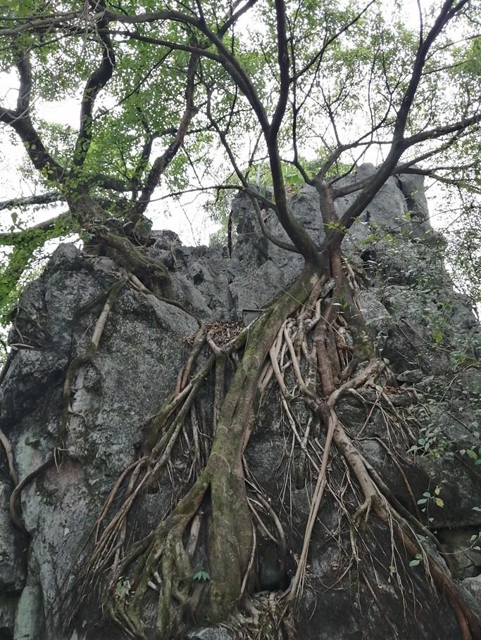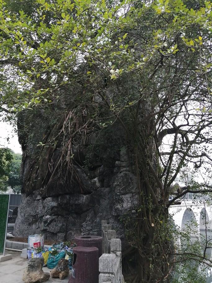 在花桥的旁边,有一座桂林最小的山,这山也叫芙蓉石,就是一块大石头,石高约10米,这石挺拔矗立像柱子一样, 所以也有“天柱”之名。面对花桥这边刻“毛泽东思想万岁”7个大字,石头上面有树,树根几乎包住了整座山。因为正在维修,没办法走进细看上面的一些石刻。
