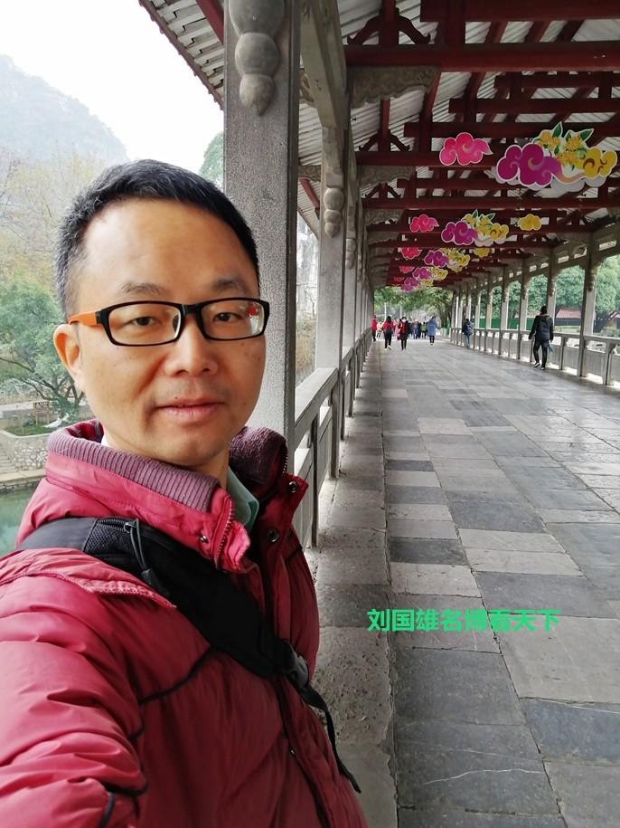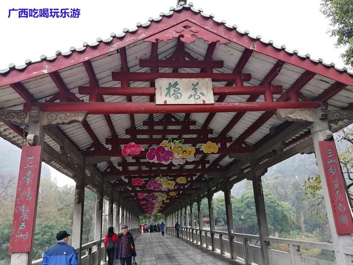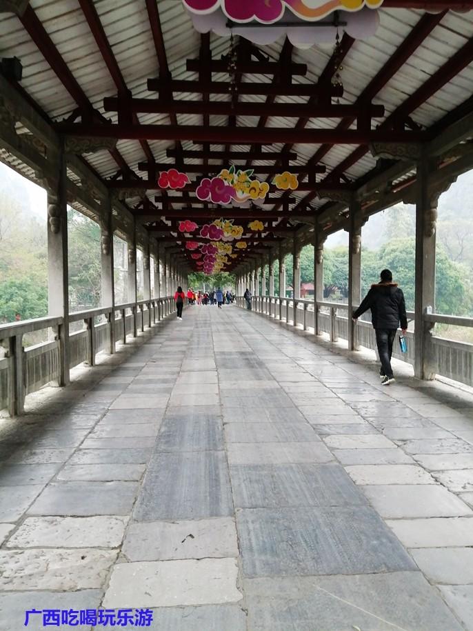 花桥上建有长廊,像长亭一样,在这里看风景可以遮风挡雨。在花桥上观景,山光水色,幽雅绮丽。导游说,小东江江边半山上的亭子是当年电影《刘三姐》的拍摄地,只是我当时没想到,这地方我中午会上这个叫“小广寒和襟江阁”亭子去,因为朋友周总的工作室就在这里。