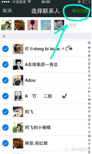 [size=15.555556297302246px]三、一次可以选择38个人,组成一个40人的组,比方说我以A字母开头的组,选择了38个人,然后右上角点确定。
