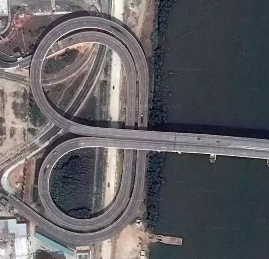 澳门与珠海:当然不是国界!只是一条奇葩又复杂的分界线!这是一个右行车道与左行车道相遇的故事。。。在澳门和珠海横琴岛之间的莲花大桥上,从内地开来的车辆需在桥下的一条形状如一半四叶草的引桥上兜一大圈,才能换车道。。看图就造多复杂了。。