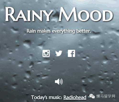 https://mmbiz.qlogo.cn/mmbiz/ZatlhsRaiaNDCgo4zTsTS8VbWUib1rd4zYt2DibVMOPGlsfySqSOXTMF7BZFW0YCKpHicshUjvJC0QwvtVXaTu9mBg/0?wx_fmt=jpeg 那如果,死都静不下来,得了写论文就要看视频的病怎么办呢?跟大家分享一个很治愈的网站http://t.cn/h9UEW这个网站叫“雨天心情”【Rainy Mood】, 只要打开网页就一直会有静谧的雷雨声, 窗外瓢泼大雨一样. 绝对安稳躁心, 实在是冥想写文画画做设计解题看书记单词的最佳伴侣. 没事儿可以试试。