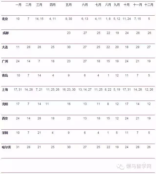 2015年中国内地考试时间