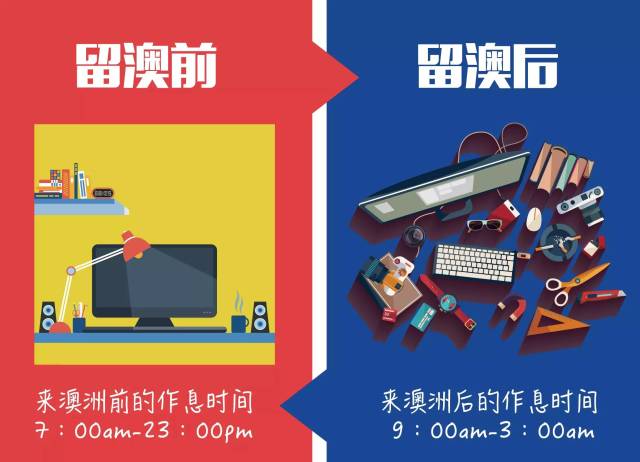 来澳洲前,作息时间是7:00am - 23:00pm;留澳后,作息时间是9:00am - 3:00am