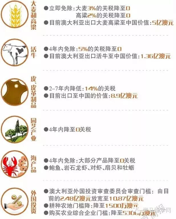 今年六月,我国驻澳大利亚大使马朝旭与澳大利亚候任驻华大使亚当斯分别代表两国政府在悉尼就中澳自贸协定生效互换两国外交照会,双方共同确认《中华人民共和国政府和澳大利亚政府自由贸易协定》于2015年12月20日正式生效并第一次降税,2016年1月1日第二次降税。也就是说,从昨天开始中澳贸易出口就已经降低关税啦!