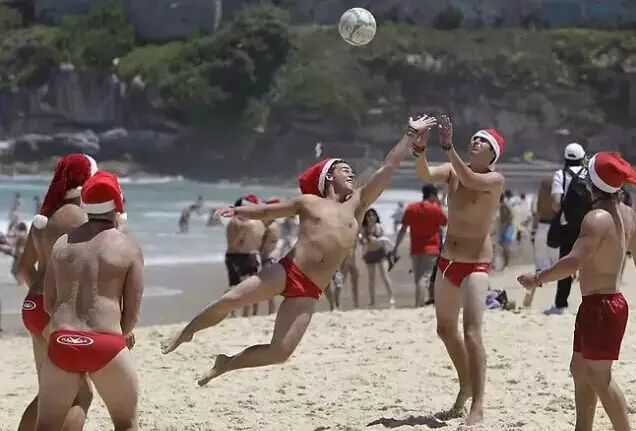 戴着圣诞帽打打沙滩排球