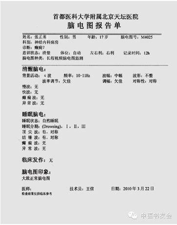 2010年3月21~22日再次入住天坛医院神经内科四病房做长程12小时脑电图(包括蝶骨电极),仍请丁成云教授诊治。脑电图报告结果:大致正常脑电图。