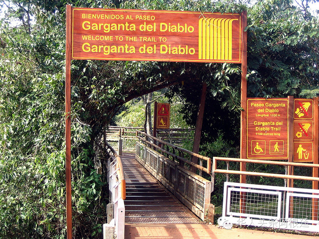 从阿根廷一侧的国家公园进入,再坐上公园内特有的生态小火车,一直做到终点站,便是通往“魔鬼咽喉”的道路了。在这里,伊瓜苏的心脏景点“魔鬼咽喉”在经过一条长约六百米的栈道之后,将会呈现在众人面前。栈道尽头将会停止在距离“魔鬼咽喉”50米的地方,面对垂直落差将近八十米的巨大瀑布,它会用巨大的噪声和使你完全睁不开眼的水花,带给你震撼的视觉,听觉,嗅觉冲击力!